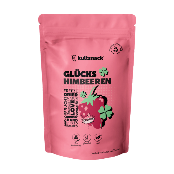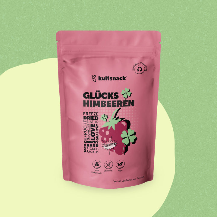 Met de gevriesdroogde frambozen "Glückshimbeeren" haal je een fruitige vitamineboost voor onderweg in huis. Voor de verpakking van 14 g worden ongeveer 140 g verse frambozen voorzichtig gevriesdroogd. Het resultaat: knapperige bessen met een intens aroma, die afhankelijk van het oogstseizoen aangenaam zoet of verfrissend zuur smaken – 100% natuurlijk .