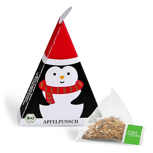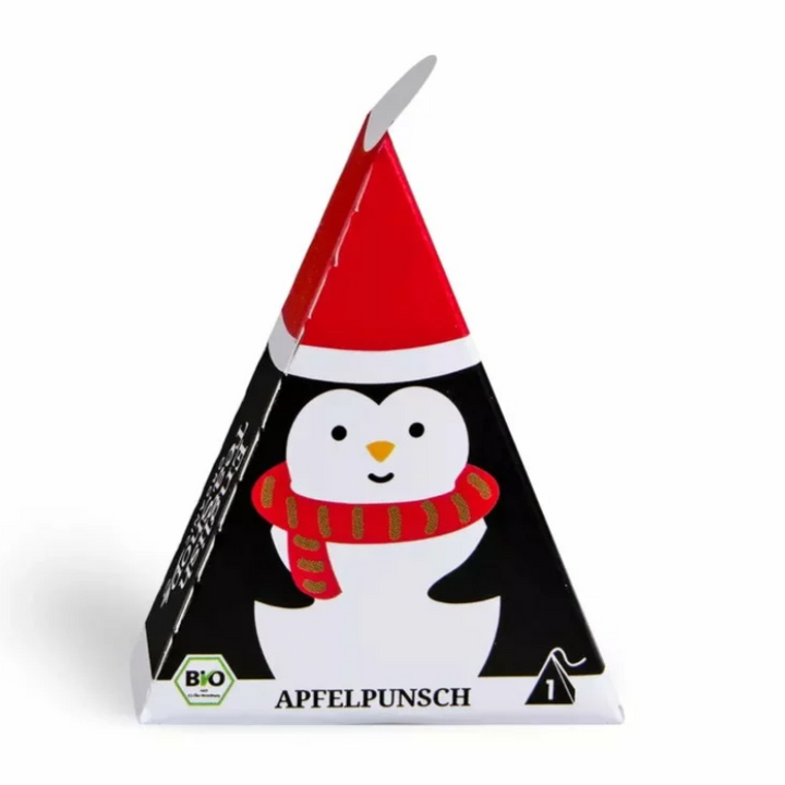 De kleine piramidevormige verpakking met pinguïn-motief bevat een uitgebalanceerde biologische kruidenmix van sinaasappelstukjes, kaneel, anijs, kruidnagels en kardemom. Voeg het eenvoudig toe aan hete appelsap en laat het 10 minuten trekken – en je hebt een heerlijke warme appelpunch.