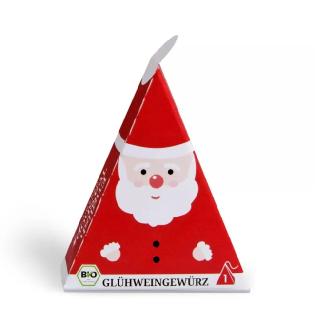 In de kleine piramidevormige verpakking met kerstmanmotief zit een fijne biologische kruidenmix van kaneel, kruidnagels, kardemom, sinaasappel- en citroenschillen. Laat het gewoon even trekken in warme rode of witte wijn en het drankje krijgt een aangename winterse smaak.