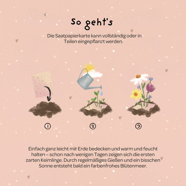Eenvoudig planten : De kaart kan in zijn geheel of in stukken gescheurd worden geplant. Met wat aarde en water ontstaat een kleurrijke bloemenzee - een mooie herinnering aan wat jullie verbindt.