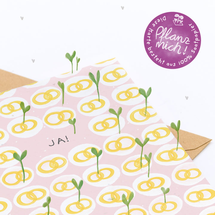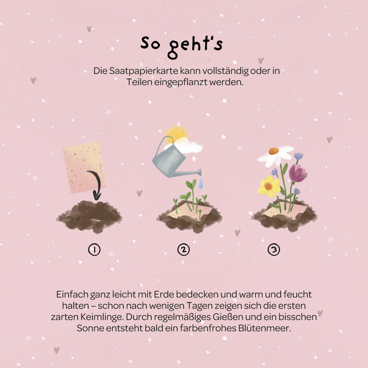 Eenvoudig planten : De kaart kan in zijn geheel of in stukjes gescheurd worden geplant. Lichtjes met aarde bedekken en vochtig houden – al snel verschijnt een kleurrijke bloemenzee die de liefde van het bruidspaar in de ware zin van het woord laat opbloeien.