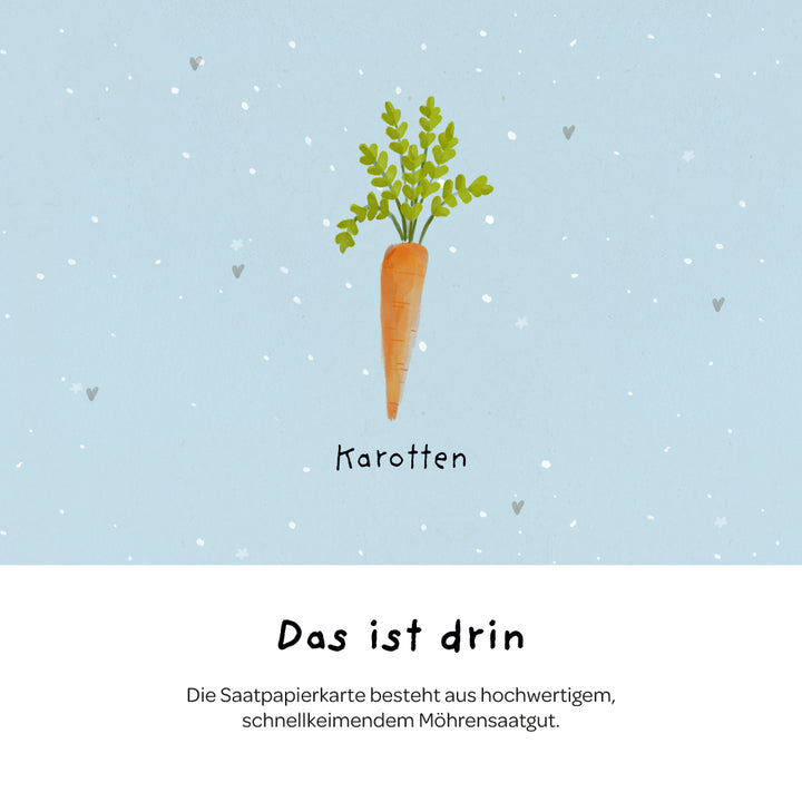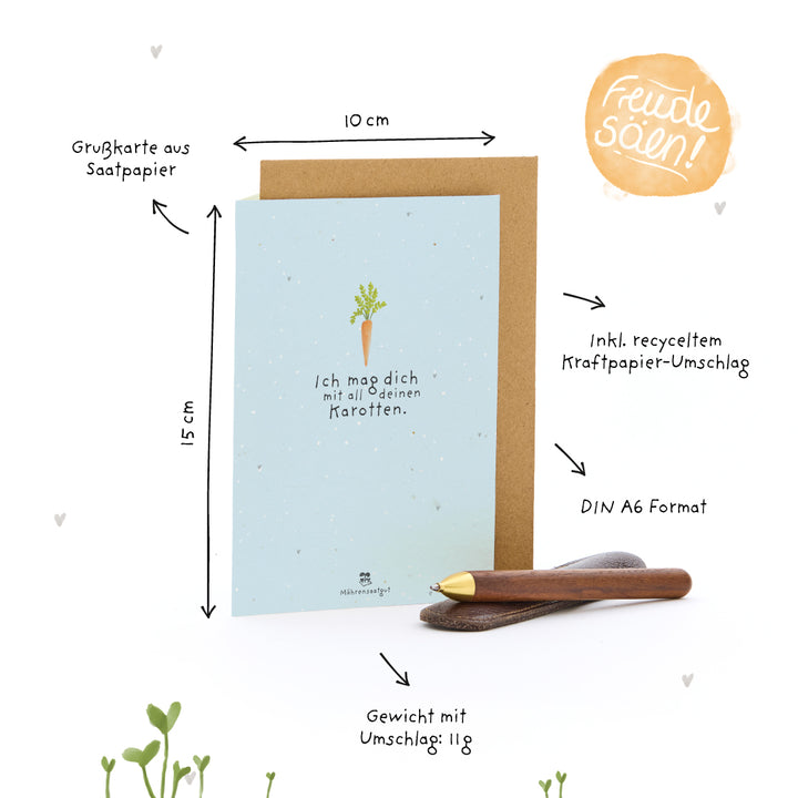 Duurzaam & plasticvrij : De kaart is gemaakt van composteerbaar zaadpapier, de envelop is van gerecycled kraftpapier en de hoes is biologisch afbreekbaar - een kaart die vreugde brengt en een klein stukje natuur teruggeeft.