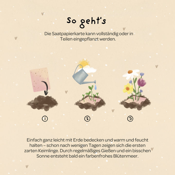 🌷 Eenvoudig planten: De kaart kan in zijn geheel of in stukjes gescheurd worden geplant. Met wat aarde, water en zon ontstaat een kleurrijke bloemenzee – als liefdevolle herinnering aan een bijzondere verjaardag.