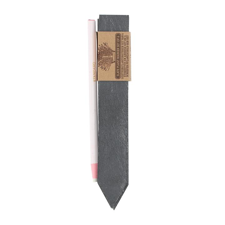De set van zes plantenetiketten van leisteen, inclusief waspotlood, is een handig hulpmiddel voor iedereen die zaait, plant of verpot – in de tuin, op het balkon of op de vensterbank.
