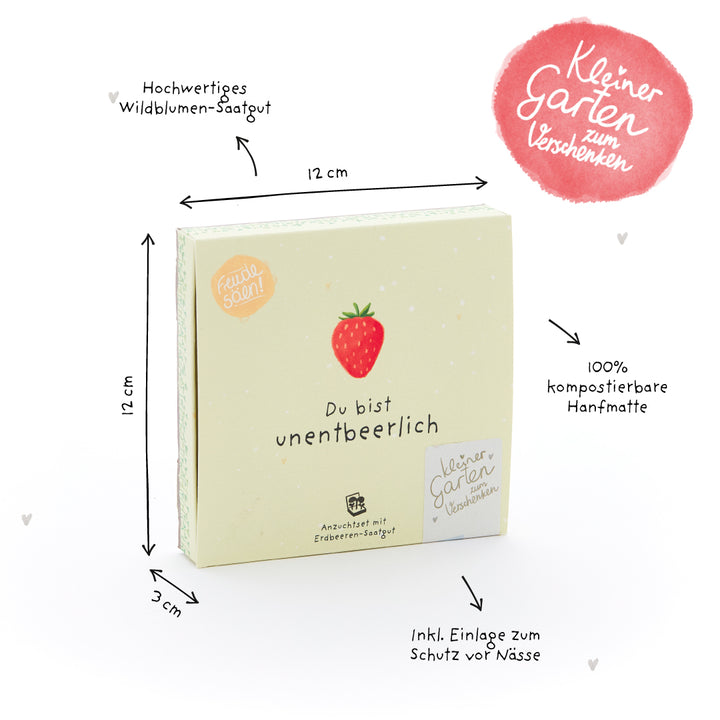 Groeit mee - net als echte waardering : als de plantjes groter worden, kun je ze met de mat en al in een grotere pot of in de tuin zetten. Zo wordt een liefdevol woordspel een klein aardbeienparadijs - en een fruitige herinnering die blijft.