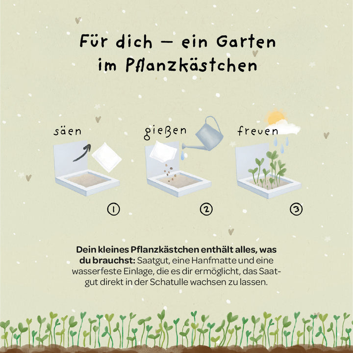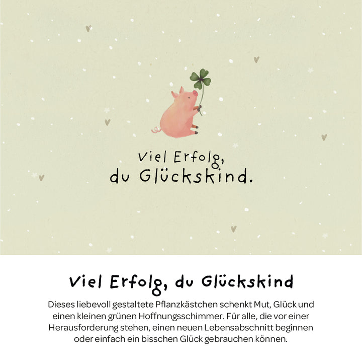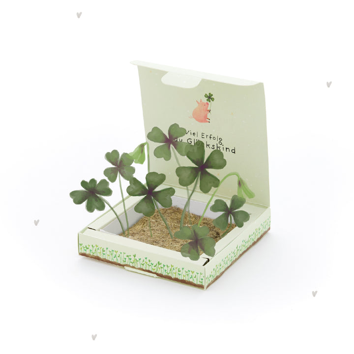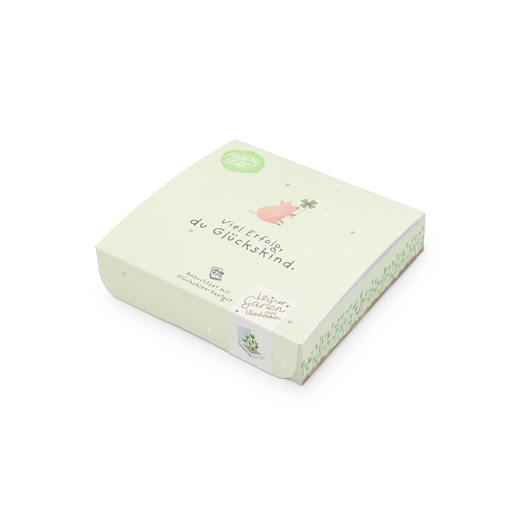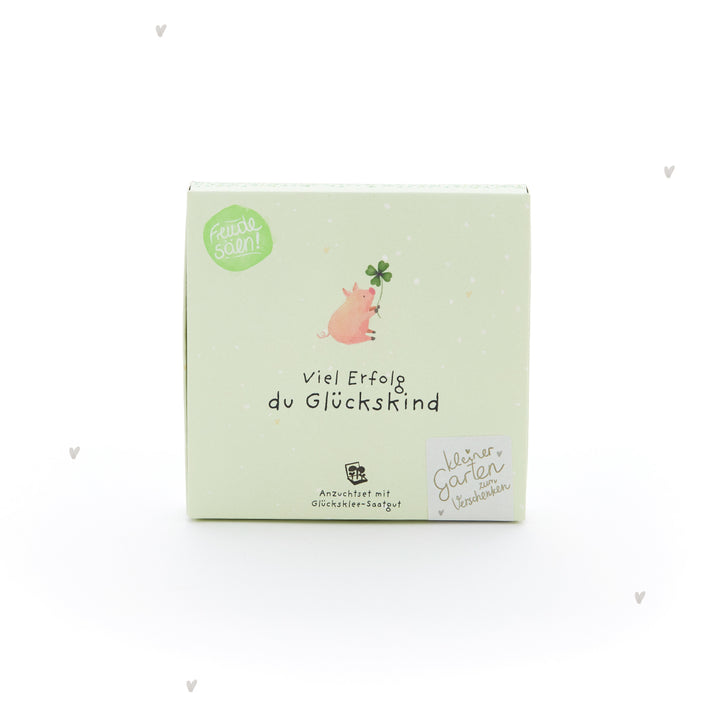 Een geluksbrenger die wortels schiet : of het nu voor een examen, een schoolafsluiting, de start van een studie of de eerste werkdag is – deze set wenst op een bijzondere manier "alles goed en veel succes". Uit het zaad groeit klaver, en met een beetje geluk verschijnt er zelfs een vierbladig klavertje – het klassieke symbool voor geluk dat blijft.