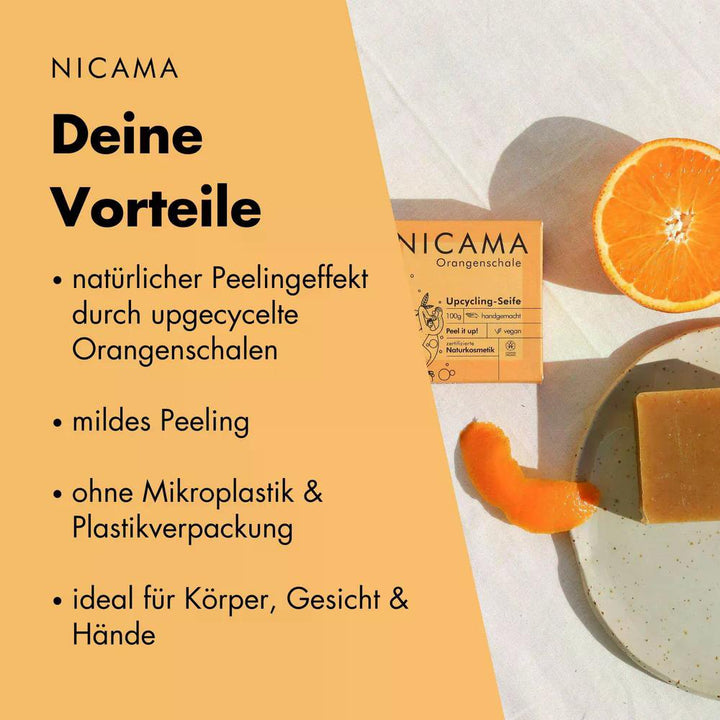 De upcyclingzeep met sinaasappelschil zorgt voor een milde reiniging en een fruitig-fris huidgevoel.